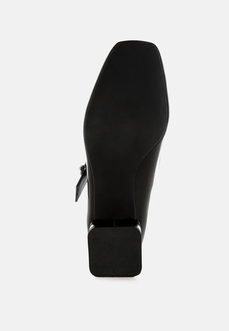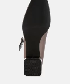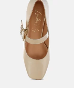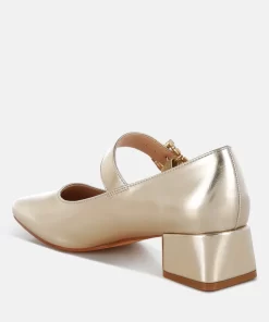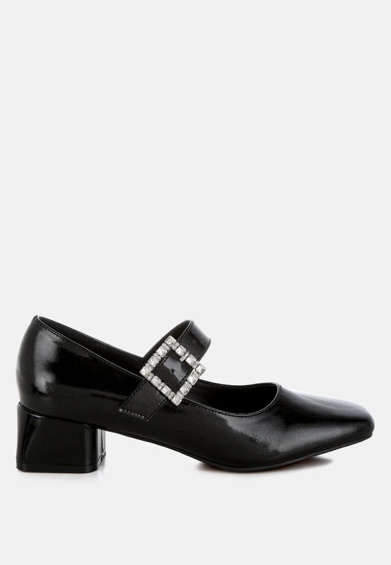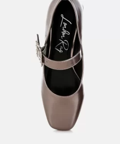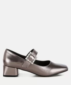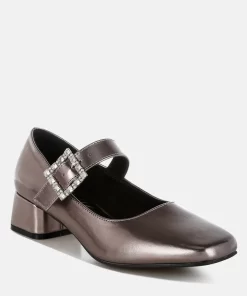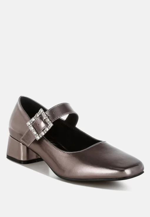 A chic update on a classic style, featuring a sparkling diamante brooch buckle strap across the ankle, square toes, and a 1.5-inch low block heel in a sleek metallic finish. These eye-catching pumps pair perfectly with partywear or mini skirts and socks for a trendy look.