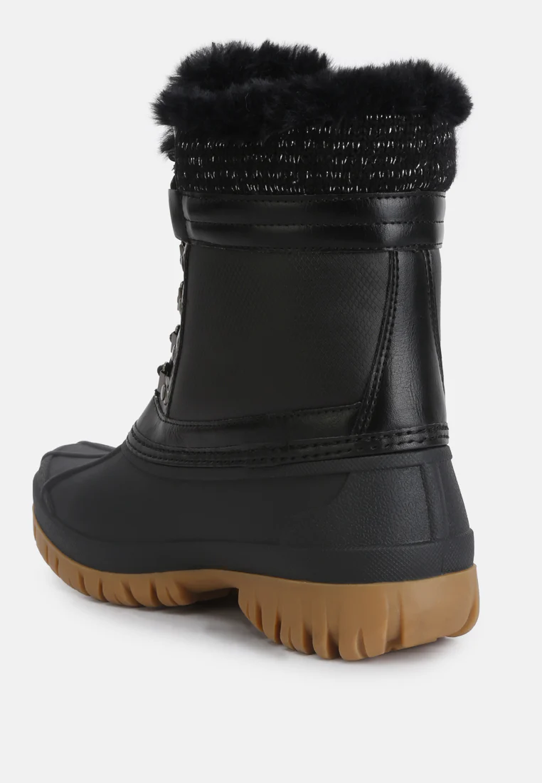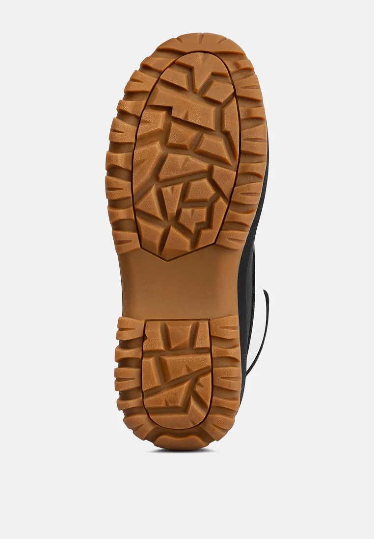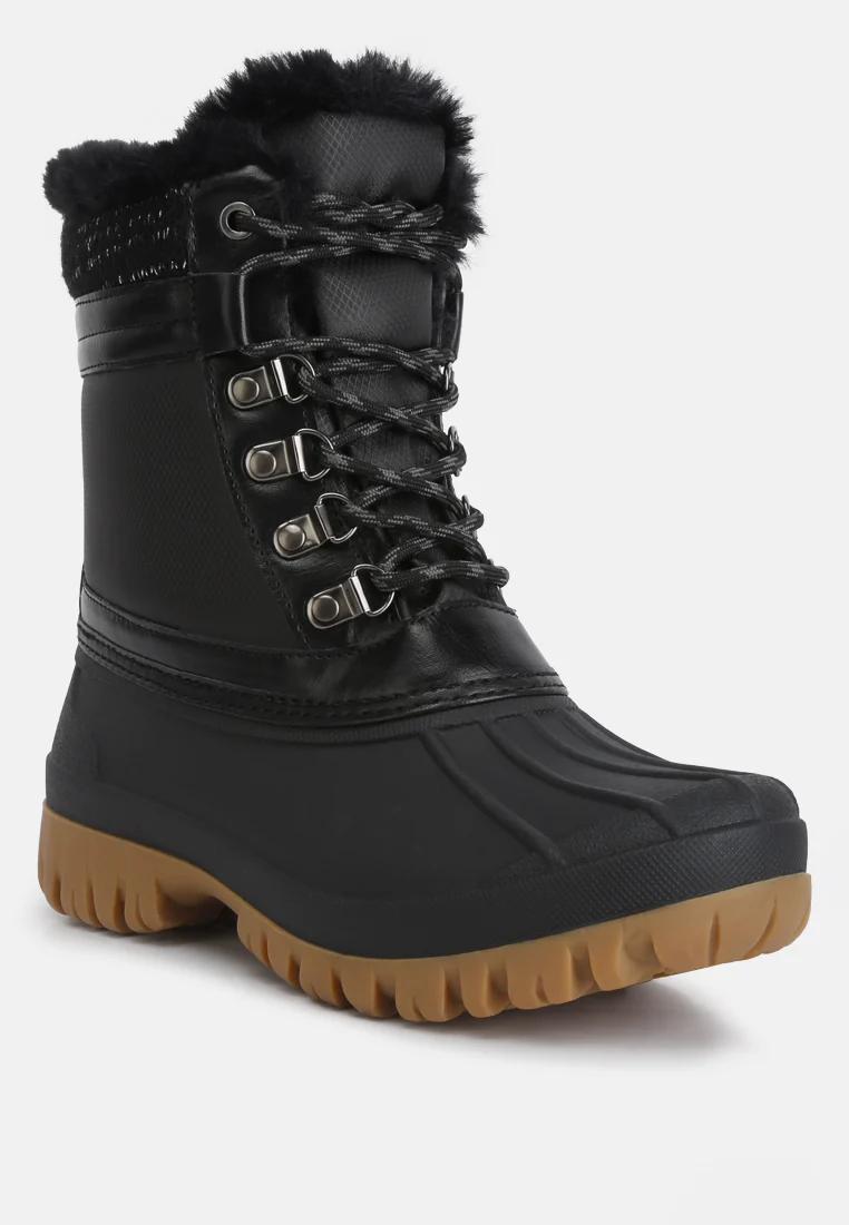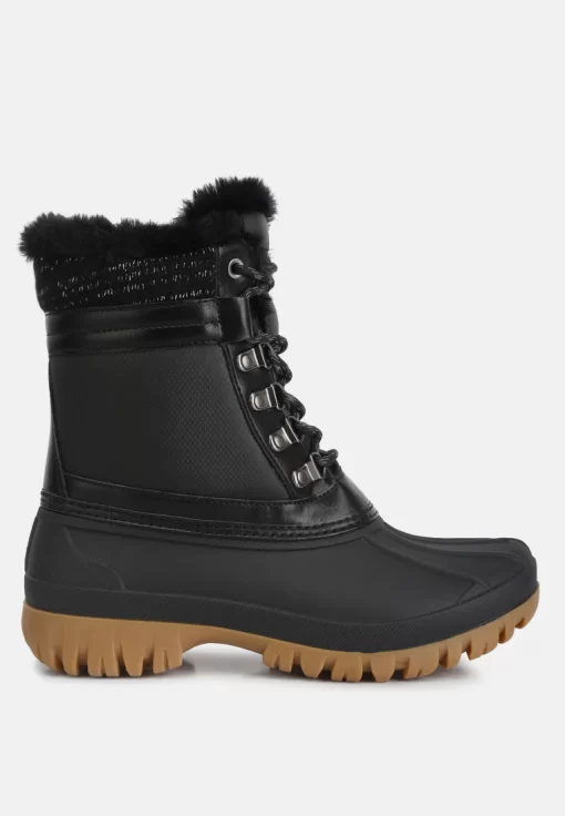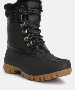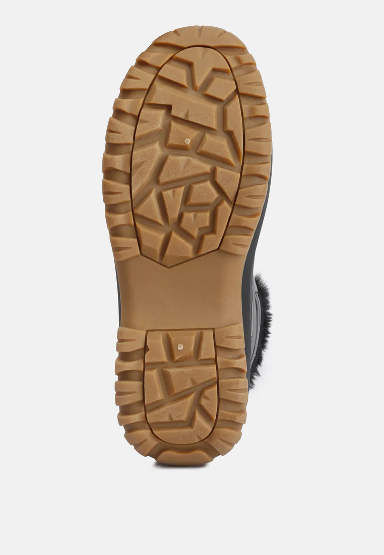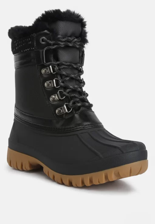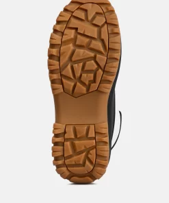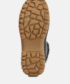This pair of boots comes with an ankle length sturdy structure, and rubber lug sole detail. It also comes with a lace up closure which resembles a bungee cord rope, and the laces are secured with utility metallic eyelets. The collar and tongue of the boots feature fur lining along with knitted detail which is placed right below the collar.