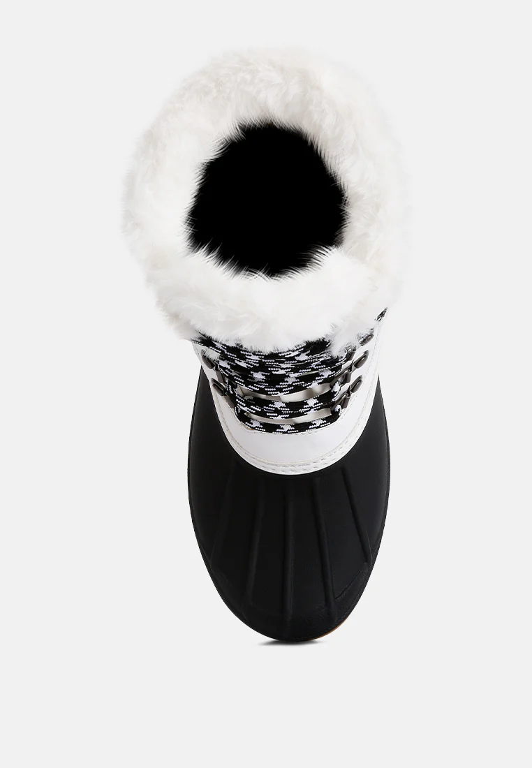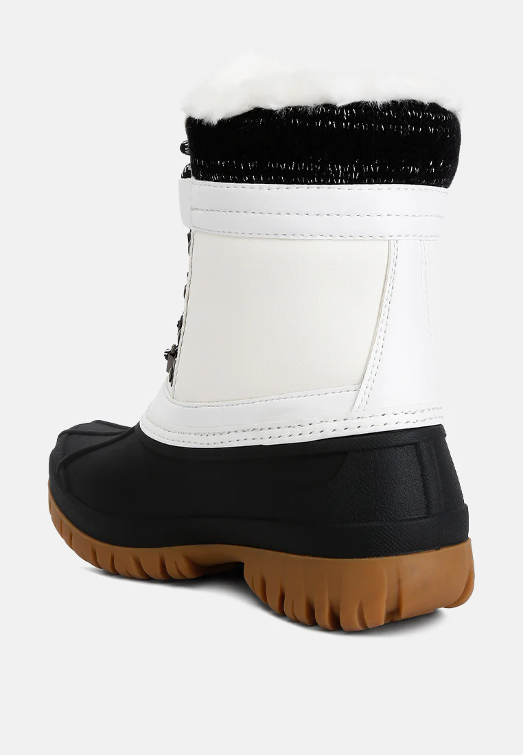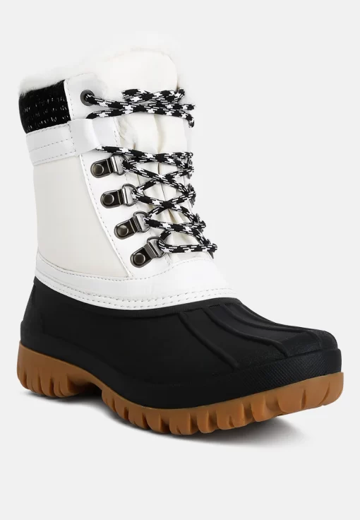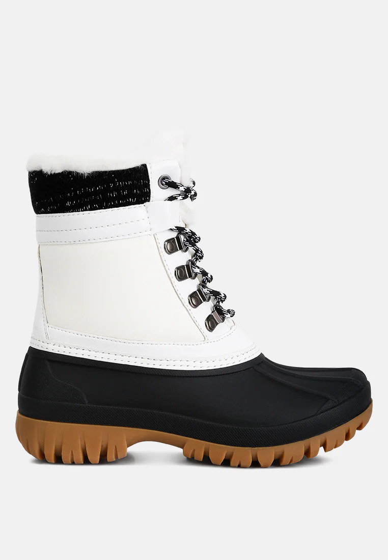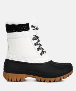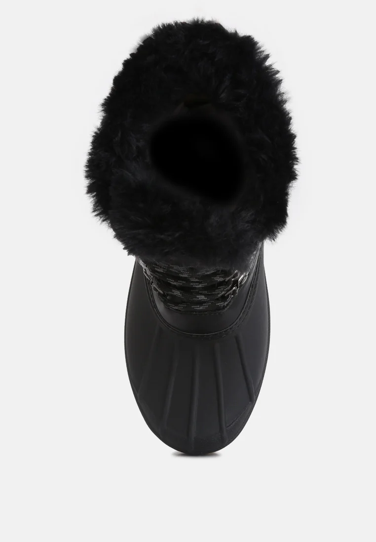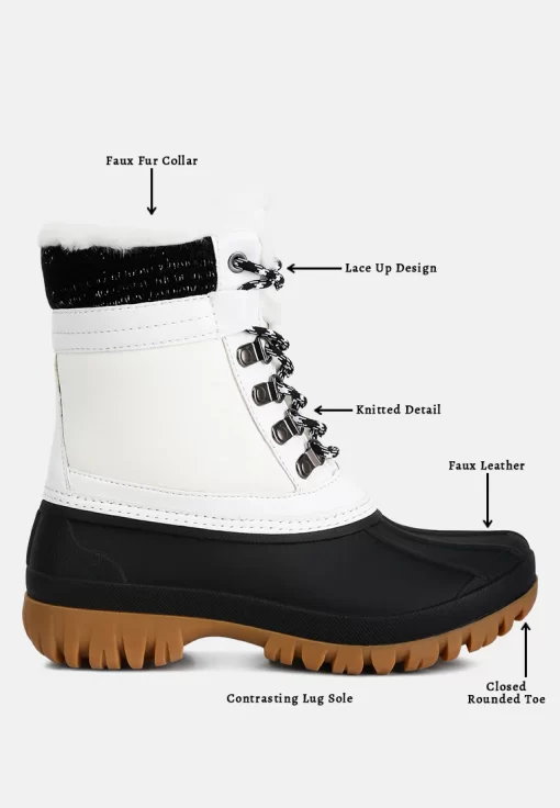 This pair of boots comes with an ankle length sturdy structure, and rubber lug sole detail. It also comes with a lace up closure which resembles a bungee cord rope, and the laces are secured with utility metallic eyelets. The collar and tongue of the boots feature fur lining along with knitted detail which is placed right below the collar.