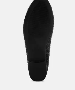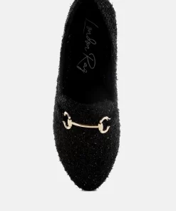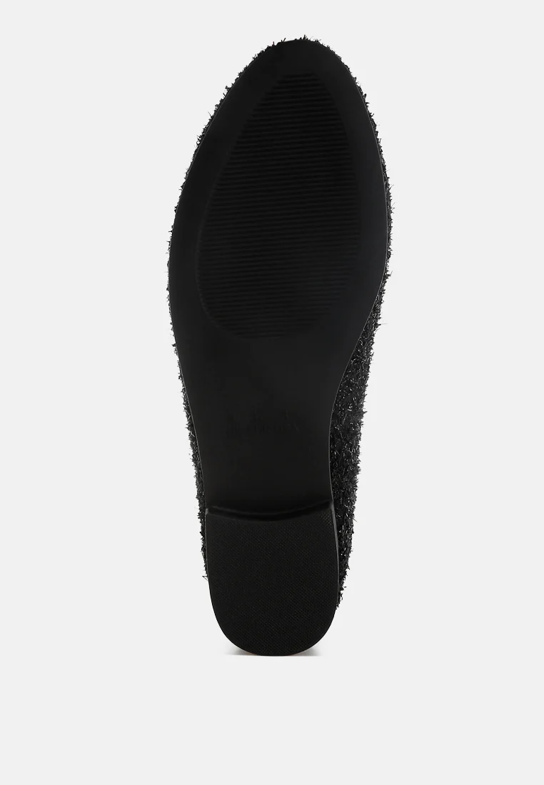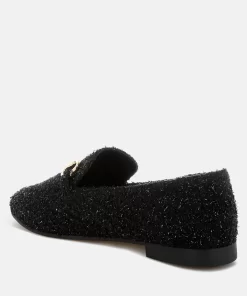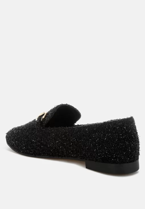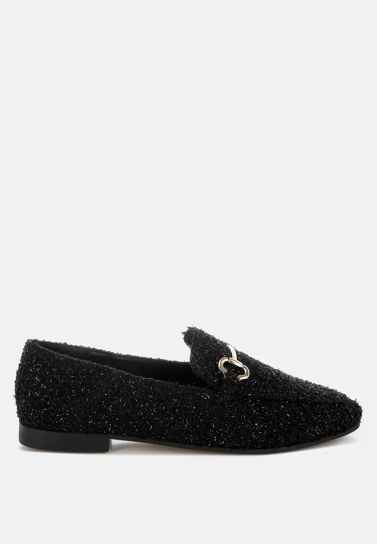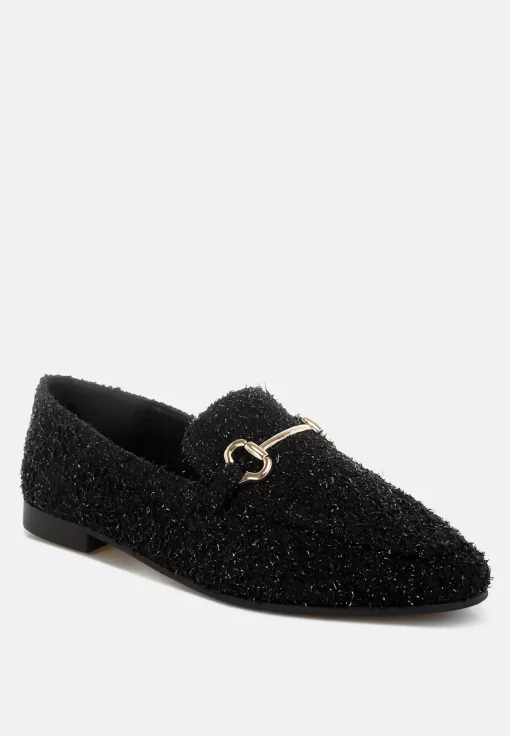 Dazzle all the way with these loafers in woven tweed with interlaced shiny yarns, offering a subtle shimmer and structured durability. The horsebit embellishment enhances the elegance. The comfortable cushioned insole and the flat heel make them a practical choice. Style these loafers with a tailored co-ord set for a bold statement.