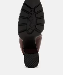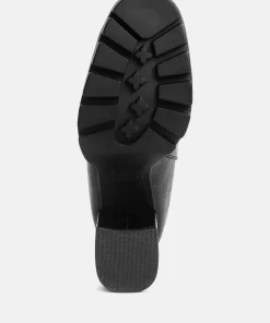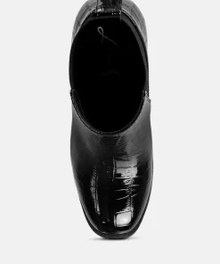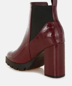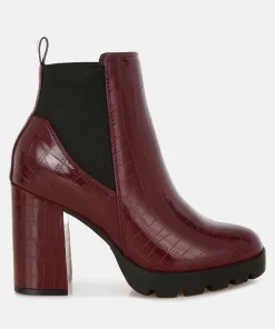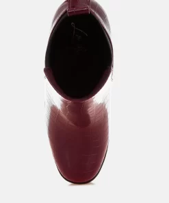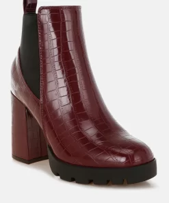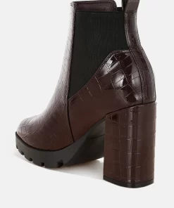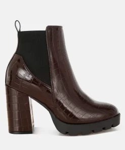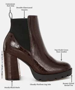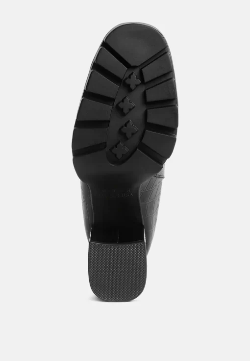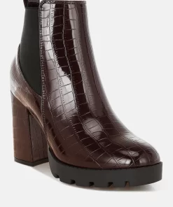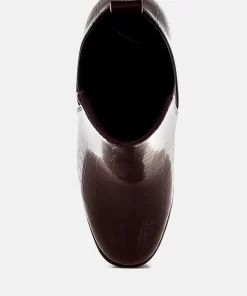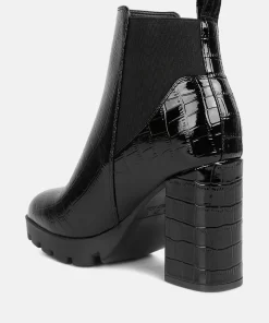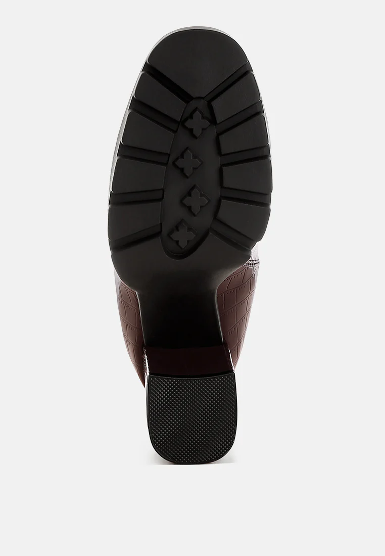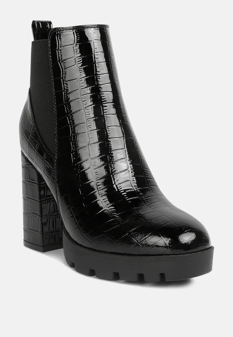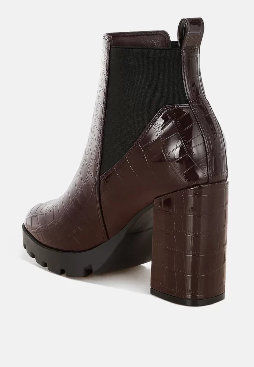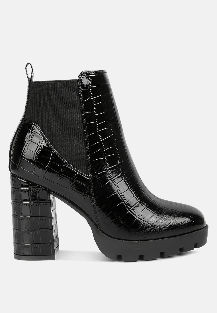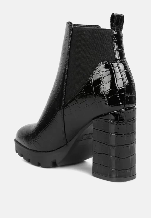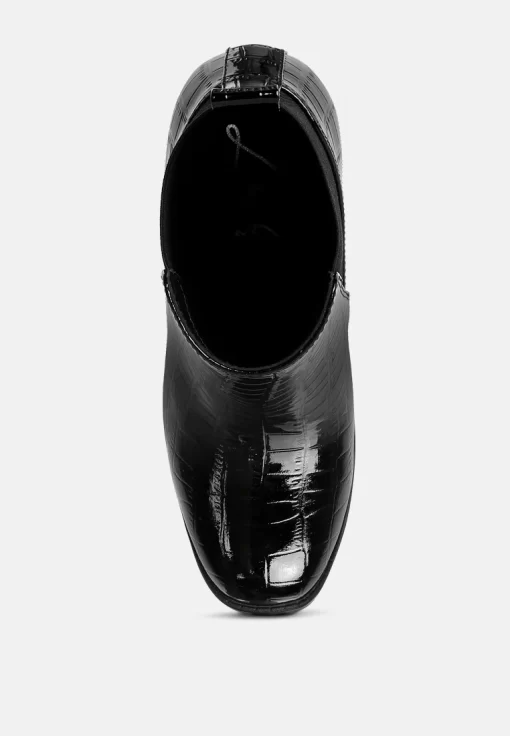 Boots with croc texture are a stylish and edgy footwear option that combines the classic appeal of sleek boots with the unique texture and pattern of crocodile skin. The boots come with chunky blocki heel that also features the crocodile texture. And include elastic gusset on both sides making it easier to wear them.