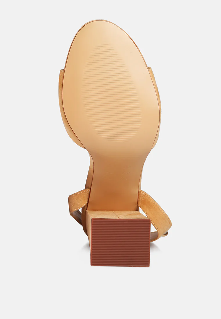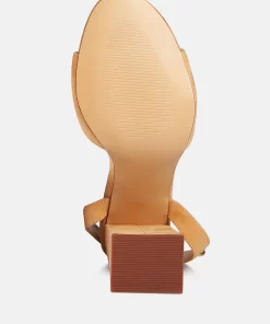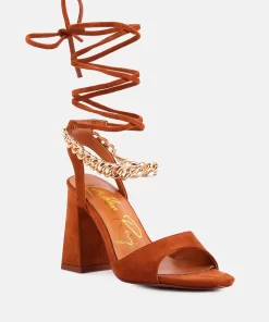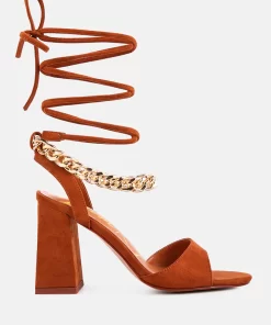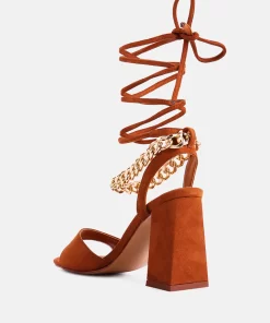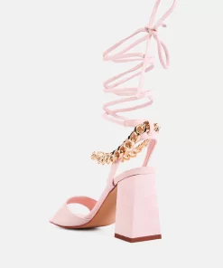 The triangular block heel sandals have a tie-up detail that makes them sexy and sleek, while the metal chain detail adds a fun aesthetic element to the strap. The thick block heels and cushion padded insole make the sandals comfortable to wear. These are perfect as party shoes, wedding guest shoes, bridal shoes, and much more.