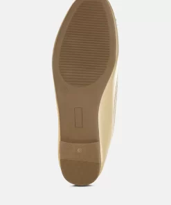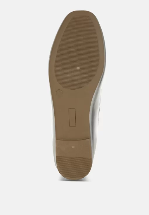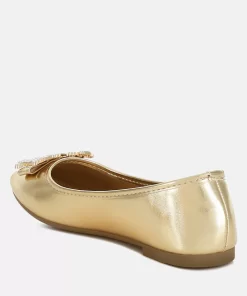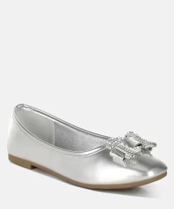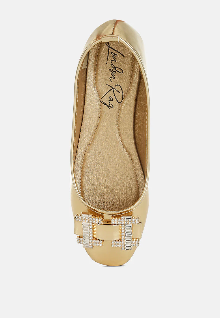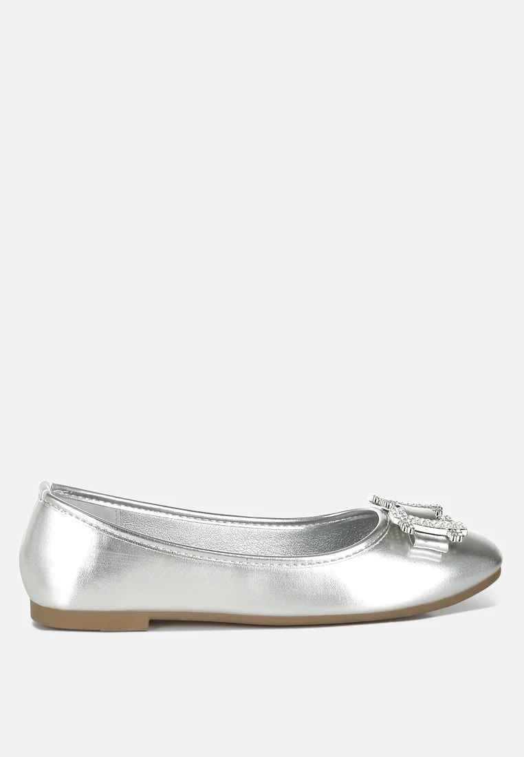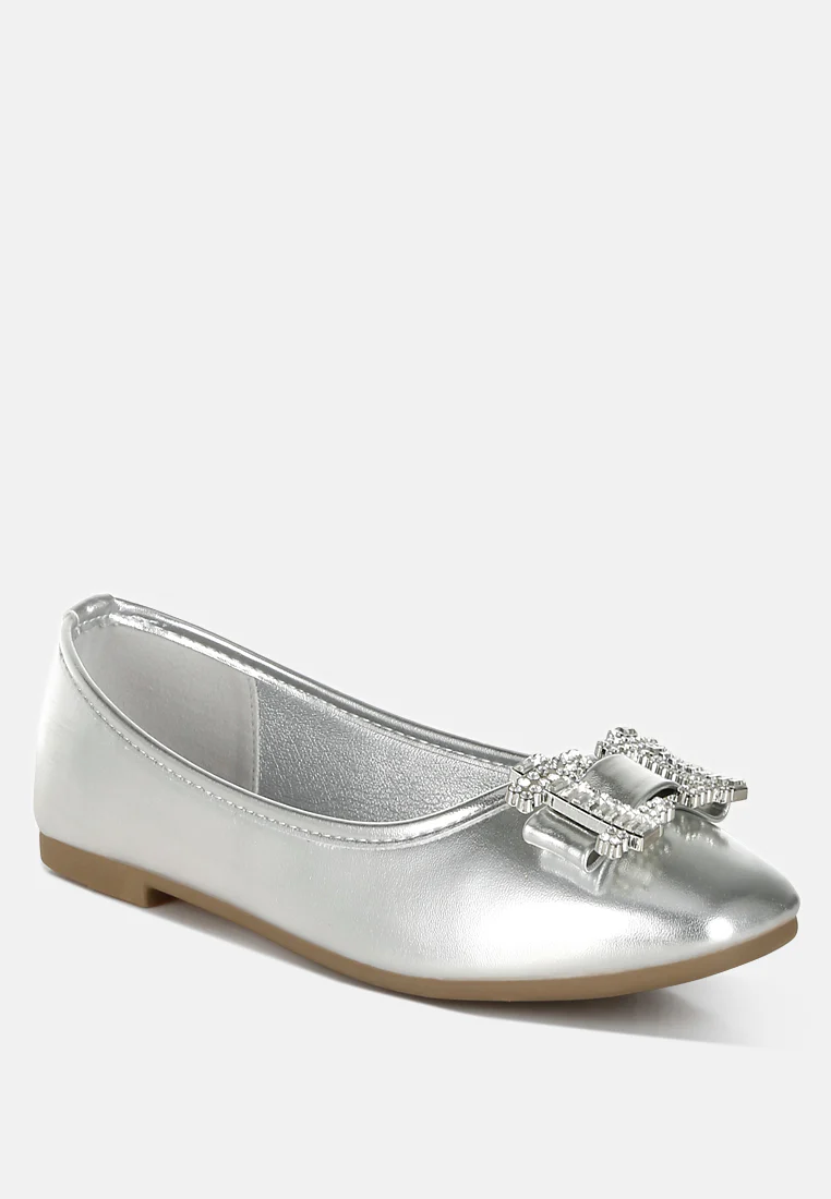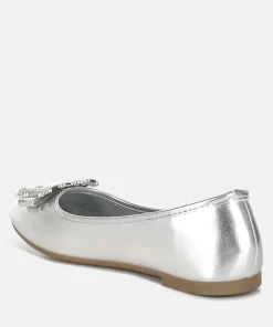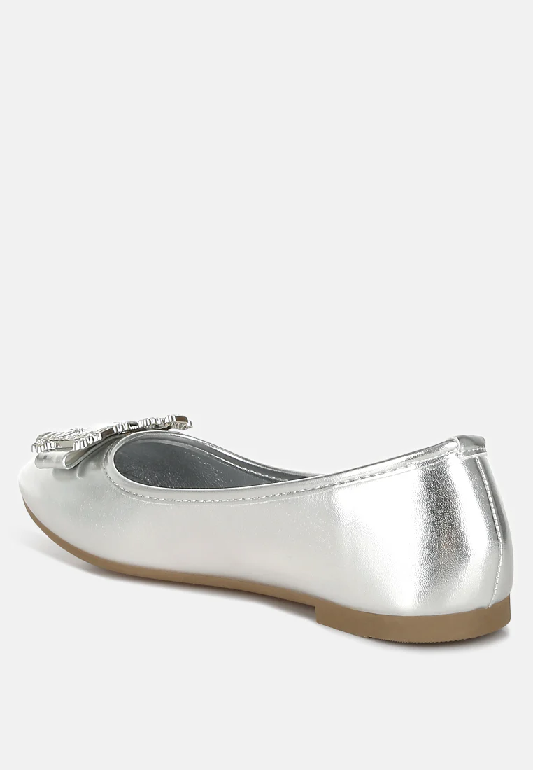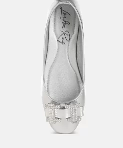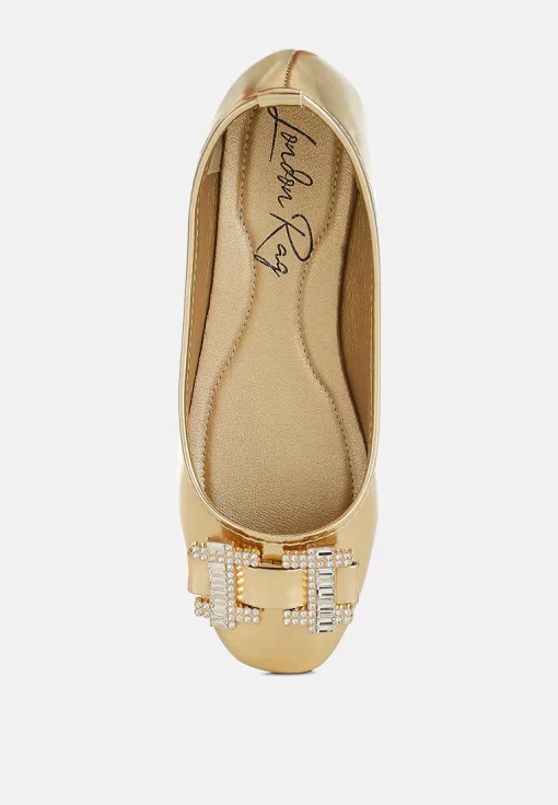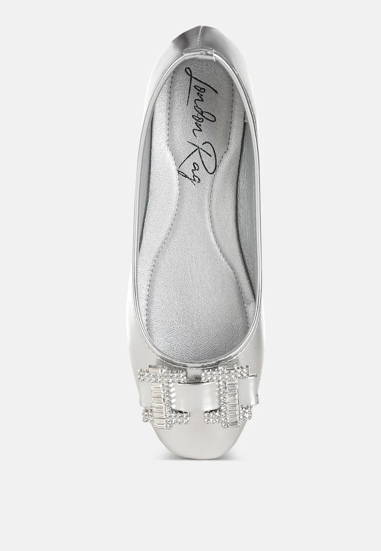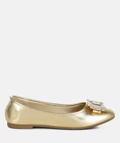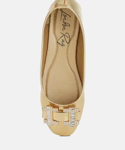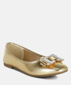 Set new fashion standards with this pair of ballerinas, crafted with premium metallic faux leather. Flaunting an exquisite rhinestone-embellished buckle and plush cushion insoles, these gleaming flats with flat heels are your go-to for a polished look.