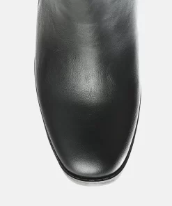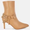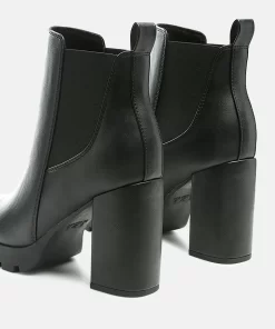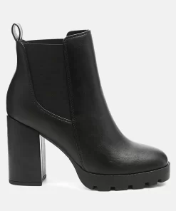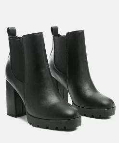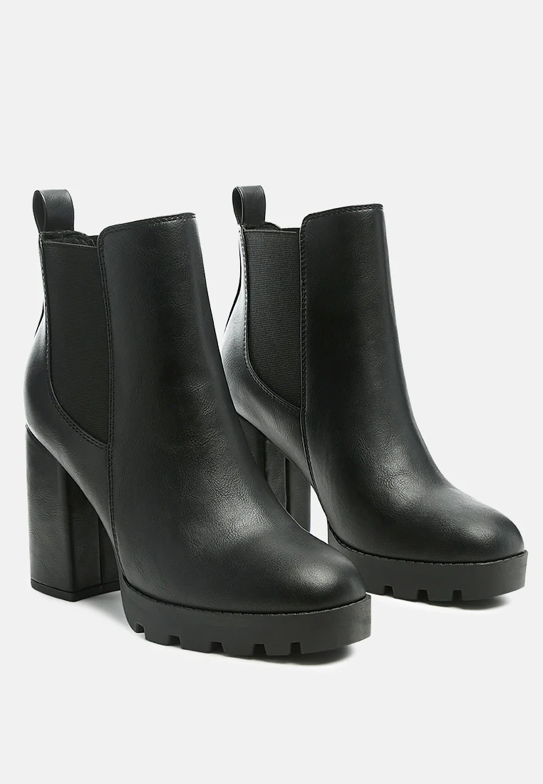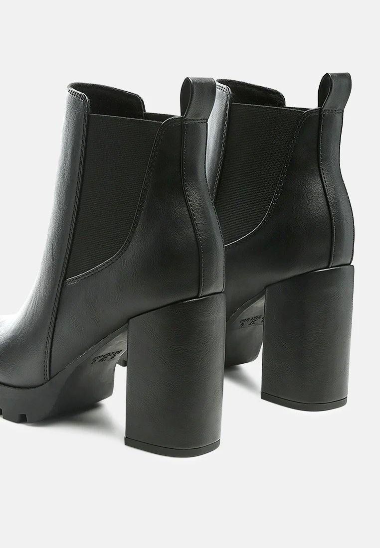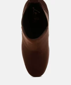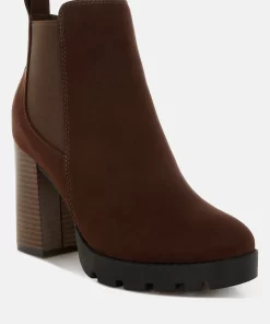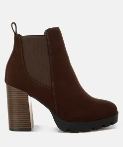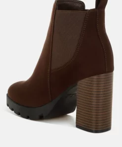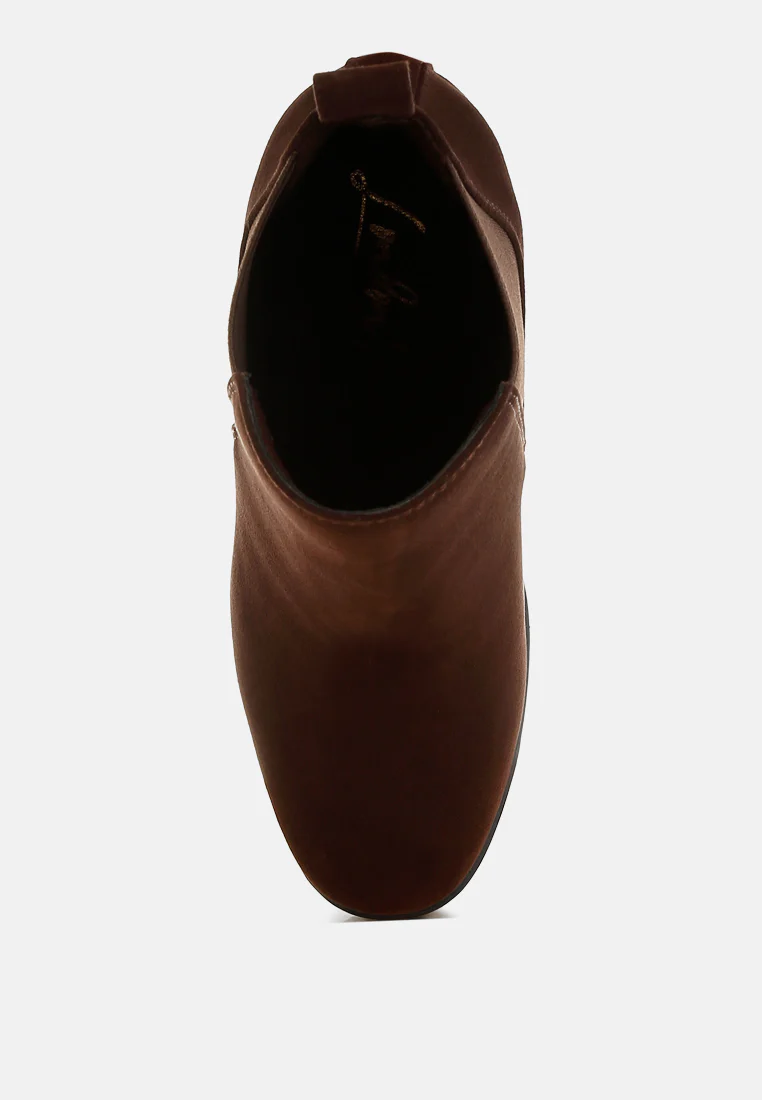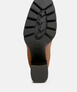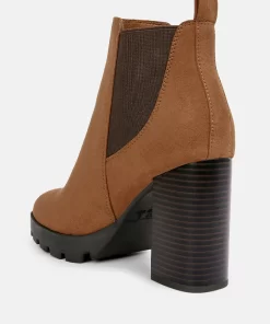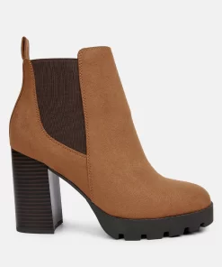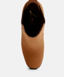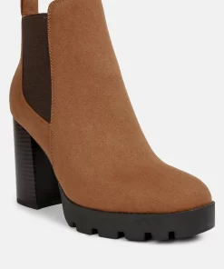 Tan block heeled boots with elasticated gussets. The easy to wear slip-on style is a stylish and trending pick!