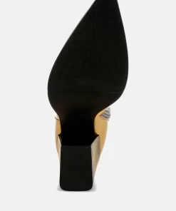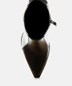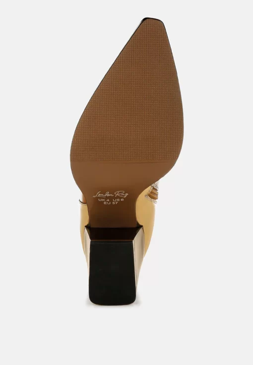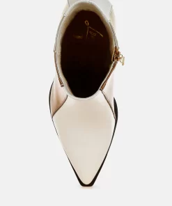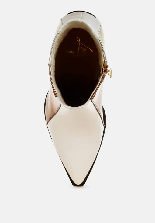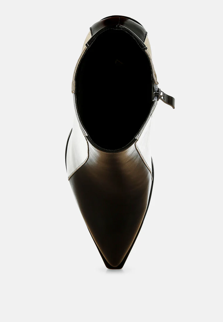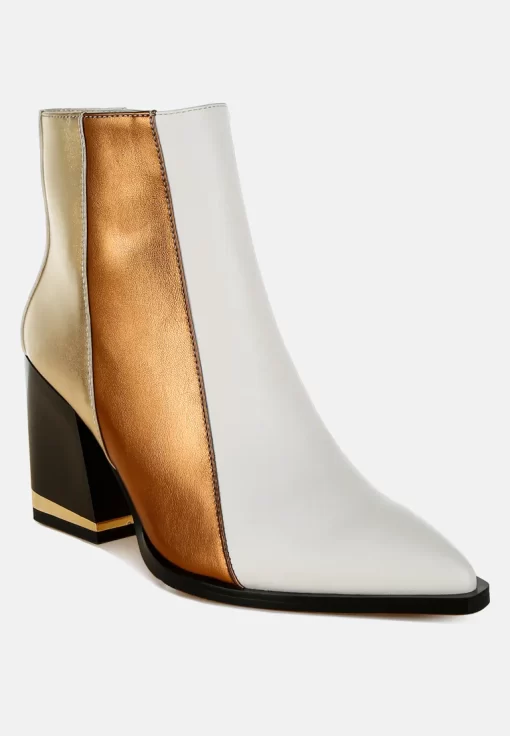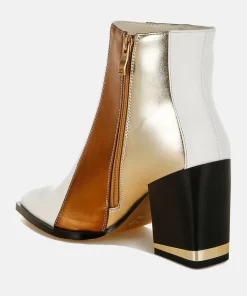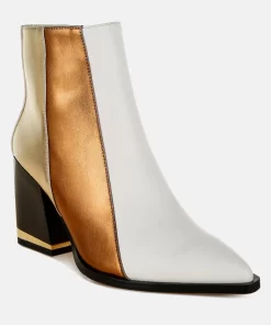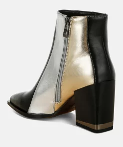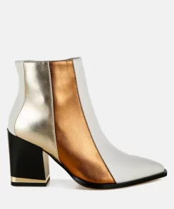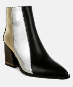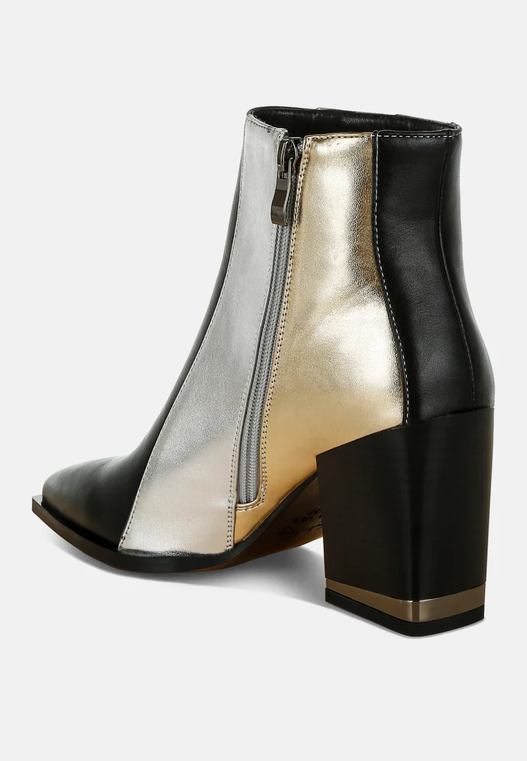 The three toned boots are a statement piece with their eccentric color block paneling and metallic exterior. The contrasting detail on the heels elevate the overall aesthetic of the boots while the block heels and comfortable cushion insoles offer a relaxed fit.