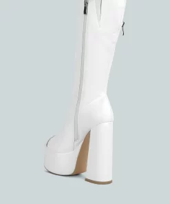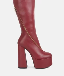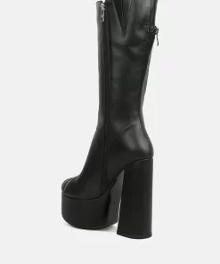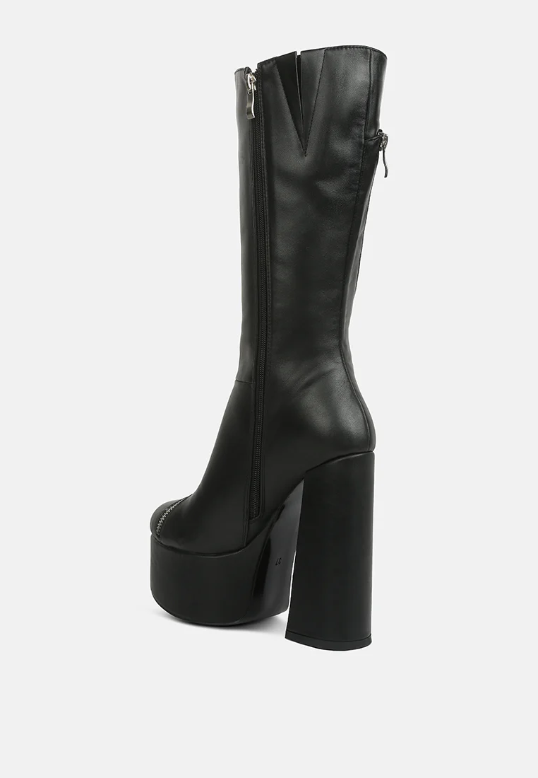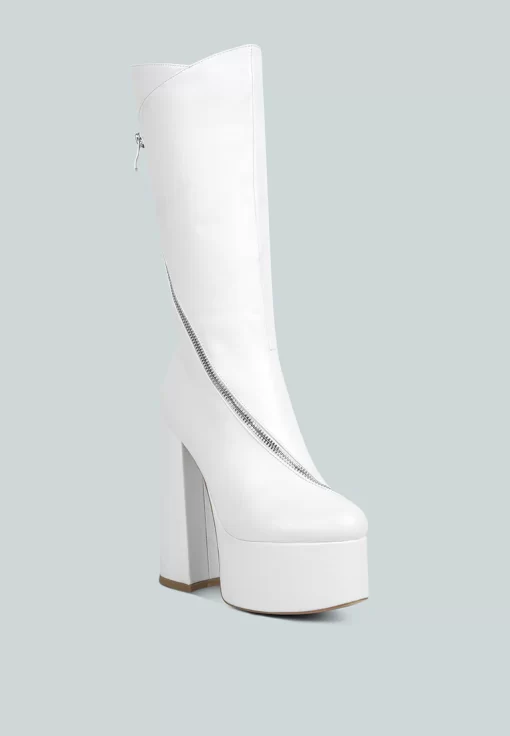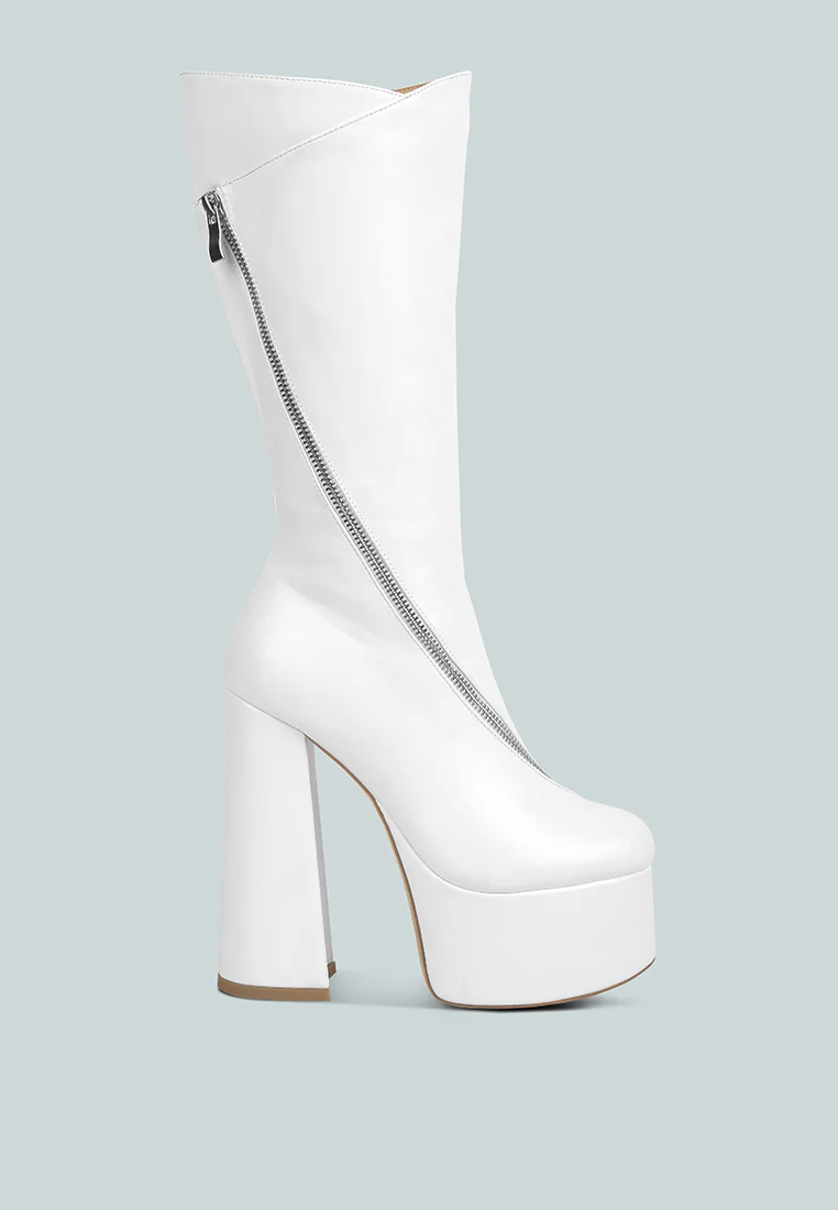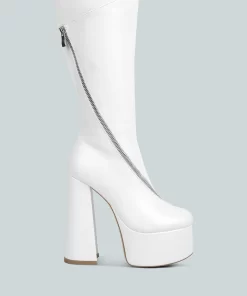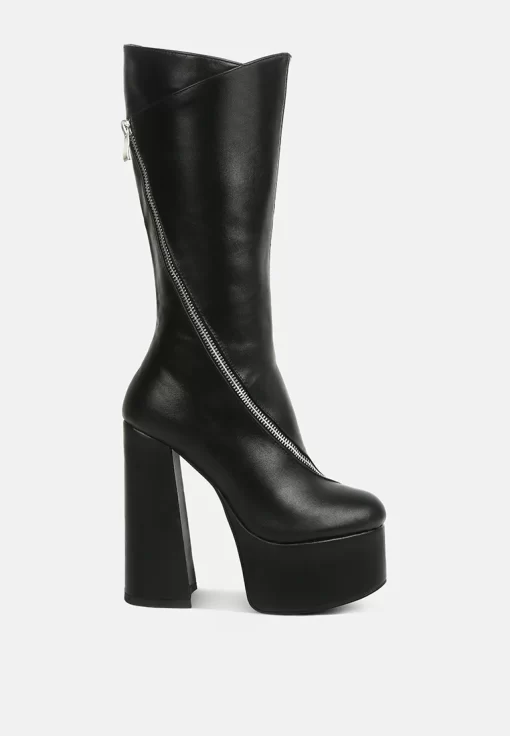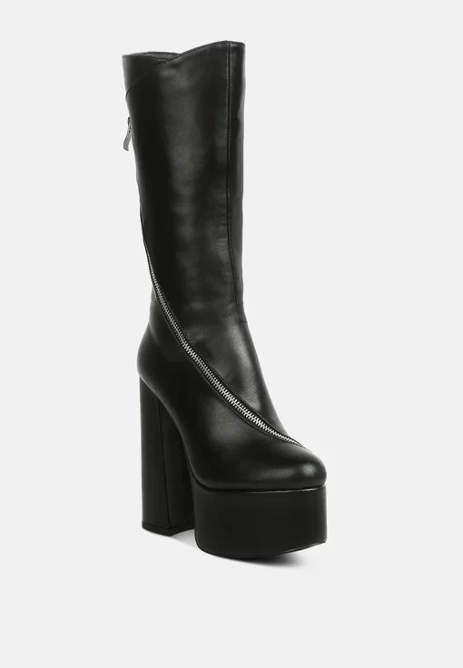 Beautiful calf boot in lush faux leather is winter high street favorite. Comes with two zipper detail; one of̴Ì? which add to the look and other serves utility. The elasticated gussets add to flexibility and enhance fit. The high block heels are further accentuated with the chunky platform.