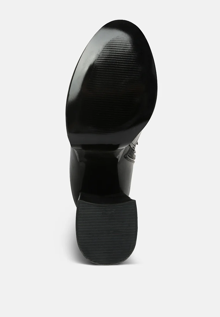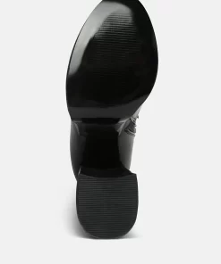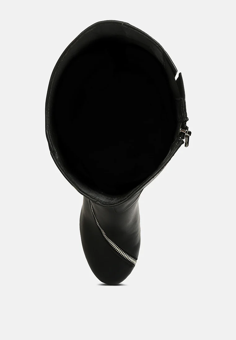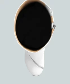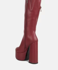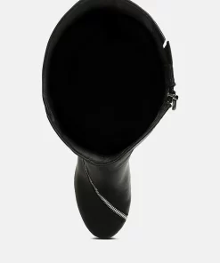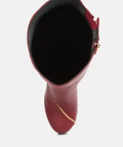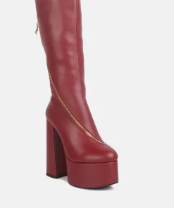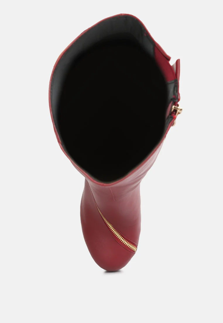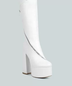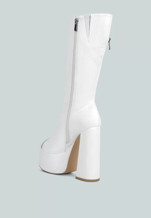 Beautiful calf boot in lush faux leather is winter high street favorite. Comes with two zipper detail; one of̴Ì? which add to the look and other serves utility. The elasticated gussets add to flexibility and enhance fit. The high block heels are further accentuated with the chunky platform.