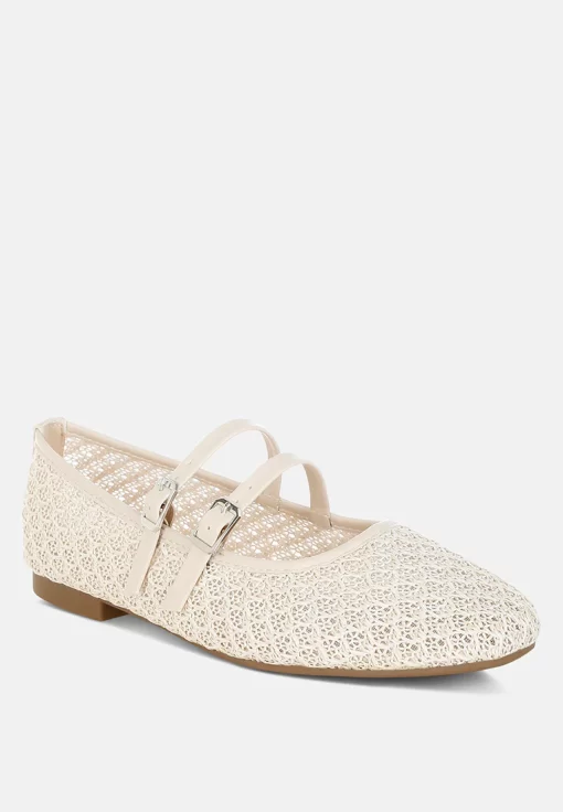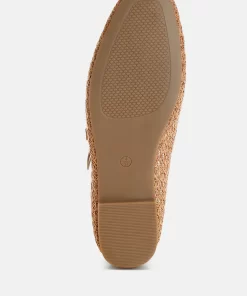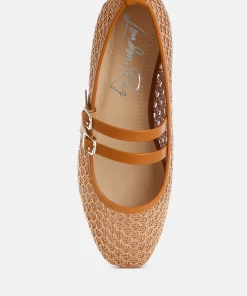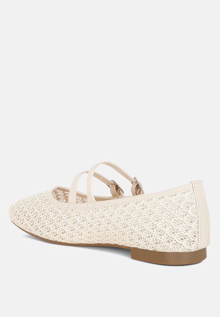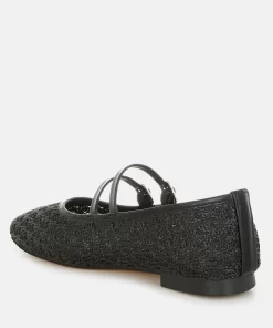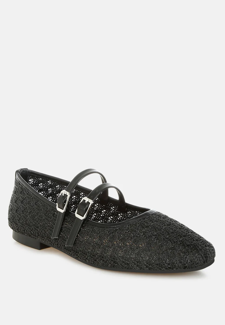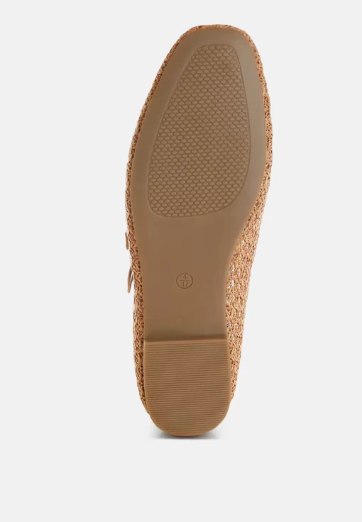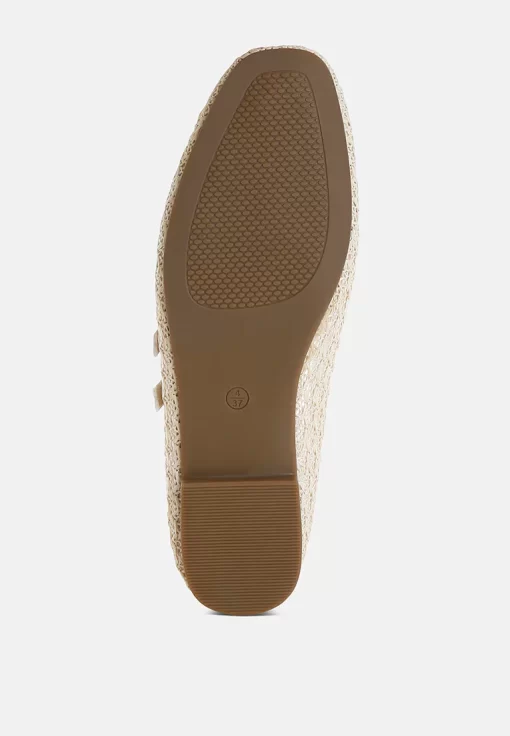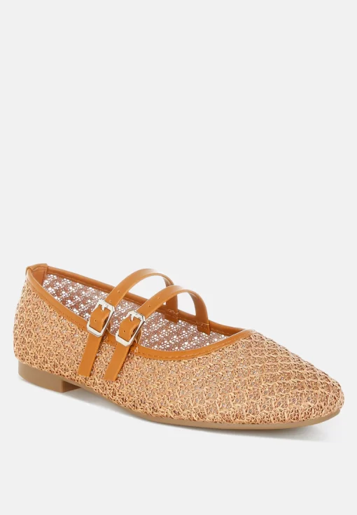 Designed for ease and style, these square-toe ballerinas feature a soft cushioned insole and adjustable pin-buckle midfoot straps for a snug fit. The woven raffia paired with premium faux leather adds an anomalous touch, making them a go-to unique pair.